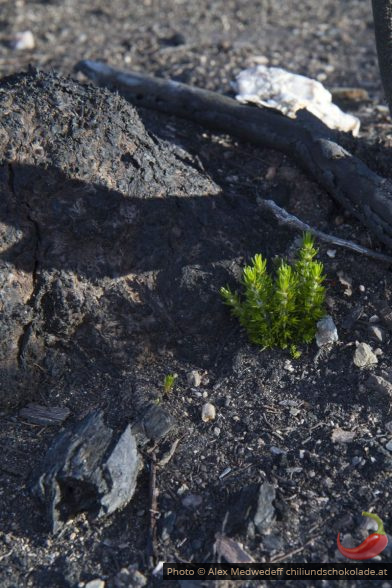 Dann wenden wir uns nach Süden, passieren ein kleines Gebiet, dem man noch eindeutig den Waldbrand letzten Jahr ansieht. Wir steigen zu einer kleinen Bucht ab und sitzen im Windschatten in der Sonne. Das Meer leuchtet türkis zu unseren Füssen und glitzert mit der Sonne um die Wette.