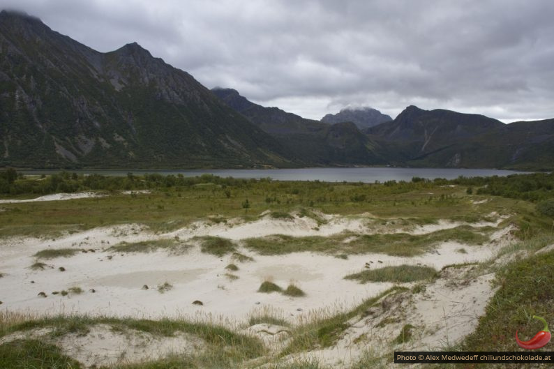 Weiter im Norden im selben Fjord gibt es helle Sanddünen, die wir aus der Nähe ansehen. Die hellen Dünnen bilden einen krassen Kontrast zu den dunklen Bergen, die an dem eher trüben Tag noch dunkler erscheinen.