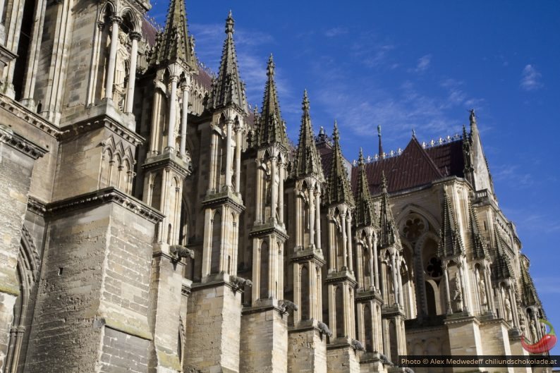 Alleine von aussen ist das Bauwerk sehr beeindruckend. Hingucker sind die vielen Figuren auf der Aussenfassade. Hier gibt es auch einen Engel, der einem anscheinend zuprostet. In der Hauptstadt des Champagners natürlich sehr passend.