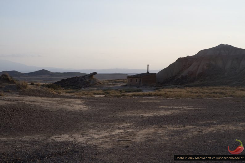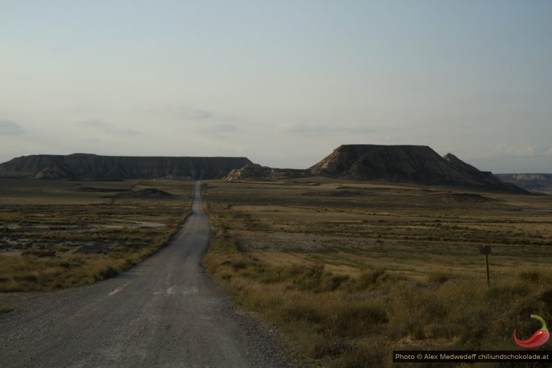 Einmal fahren wir auf einer Schotterstrasse nach Süden in die sogenannten Bardenas Negras, aber der Weg ist recht beschwerlich und führt auf eine unspannende Hochebene mit Feldern. Dort drehen wir dann um.
