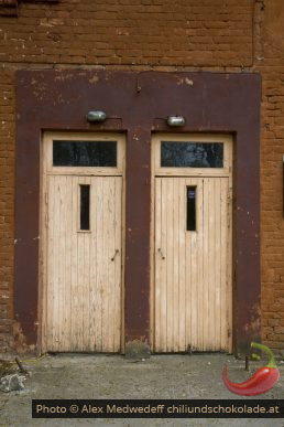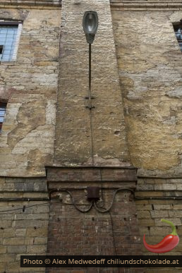 Die Gebäude sind sehr beeindruckend, das Fabrikgelände ist riesig. Wir gehen über eine Brücke über den Fluss und zu weiteren Gebäuden hinüber. Die Fabrik hat die Wasserkraft aus dem Fluss für die Antriebe der Maschinen benutzt. Wir gehen durch mehrere Höfe, schauen in alte Produktionshallen hinein.