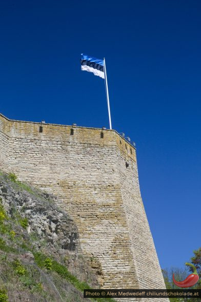 Estland zeigt gegenüber Russland deutlich vorfür es steht: an der Burg hängen neben der estischen auch die ukrainische und die europäische Fahne.