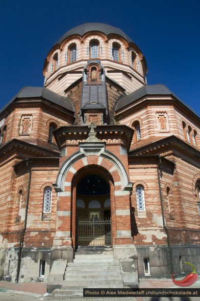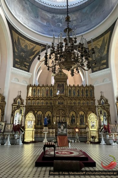 Wir fahren am Fluss weiter, immer wieder bieten sich uns schöne Ausblicke auf die beiden Burgen. Wir besuchen die orthodoxe Kirche, überall sind Frauen am Putzen und Abstauben.