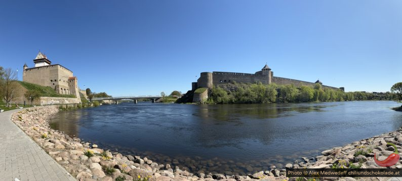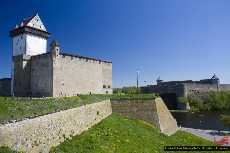 Der Burg auf der estischen Seite steht auf der russischen Seite ebenso eine Burg gegenüber. Die beiden Orte haben geschichtllich eine enge Verbindung, anfang des 20. Jahrhunderts gehörten beiden Burgen zu Estland, da die russische Grenze weiter östlich verlief. Erst nach 1940 wurde die Narva zum Grenzfluss.