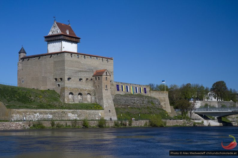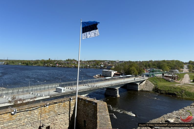 Estland zeigt gegenüber Russland deutlich vorfür es steht: an der Burg hängen neben der estischen auch die ukrainische und die europäische Fahne.