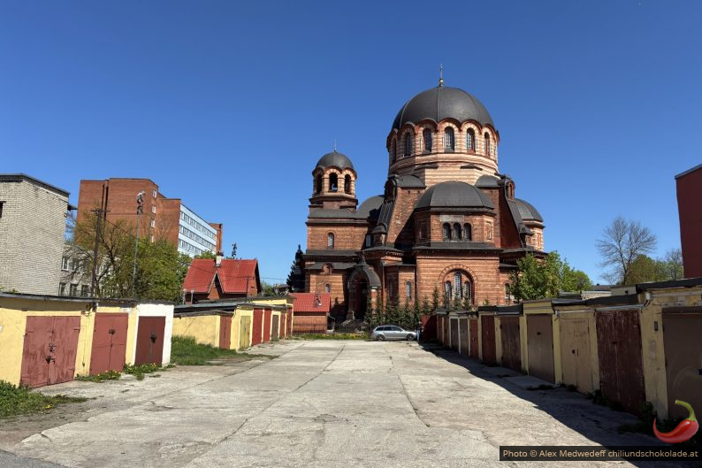 Dann machen wir einen Bogen durch die Stadt und radeln am Bahnhof vorbei, wo die Busse nach St. Petersburg parken. Per Luftlinie ist es dorthin nicht so weit, aber da die Grenzbrücke für Fahrzeuge gesperrt ist, muss man derzeit südlich vom Peipussee die Grenze überqueren.