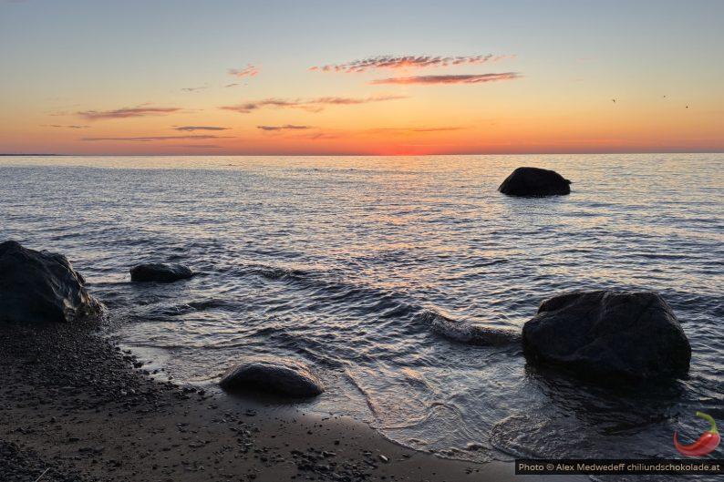 Den Abend verbringen wir an einem Strand, wo zwar für unseren Geschmack zu viel los ist, aber zumindest der Sonnenuntergang kann sich sehen lassen.