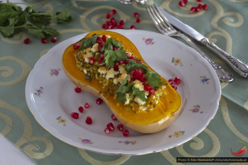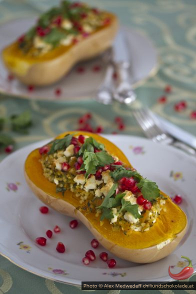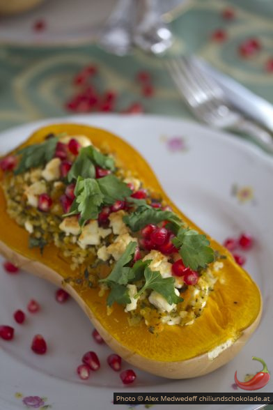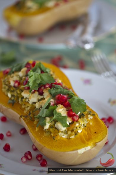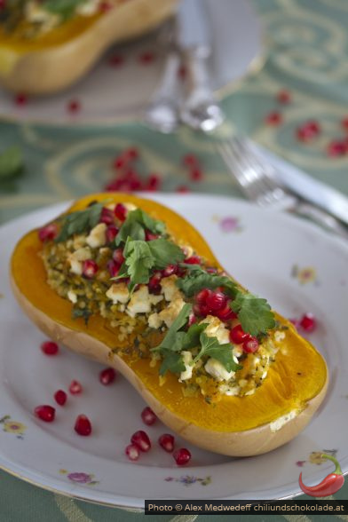 Die Fotos sind diesmal richtig schön geworden, die Granatapfelkerne zudem wie kleine Rubine darüber und passen auch geschmacklich hervorragend dazu. Diese Kürbisse könnt ihr mit bestem Gewissen zubereiten, wenn ihr Gäste erwartet.