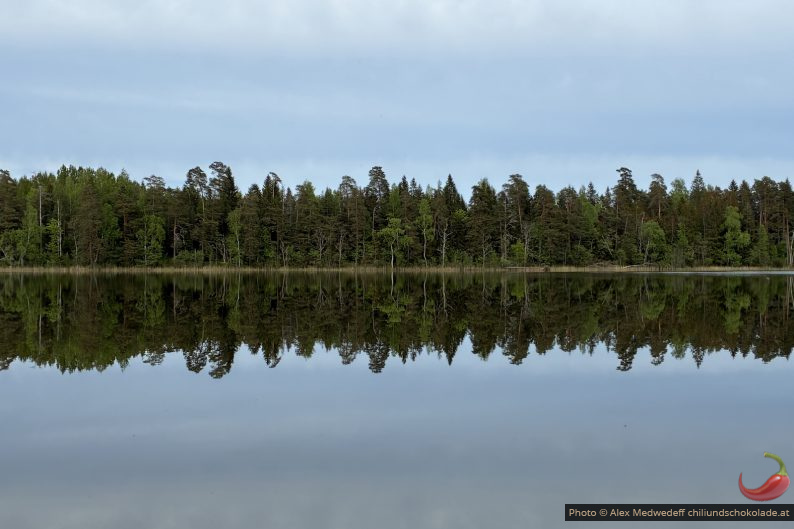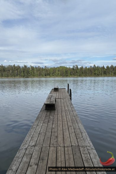 Wir verlassen Rummu und übernachten lieber auf einem Parkplatz an einem wunderbaren See. Ich gehe natürlich schwimmen, auf dem Steg essen wir aber zu Abend, weil sich dort lustigerweise keine Mücken hinverirren.