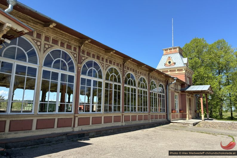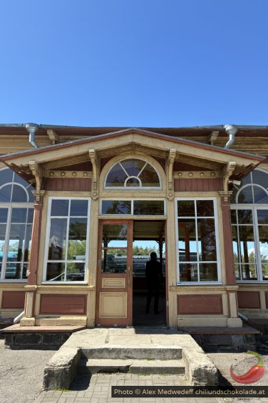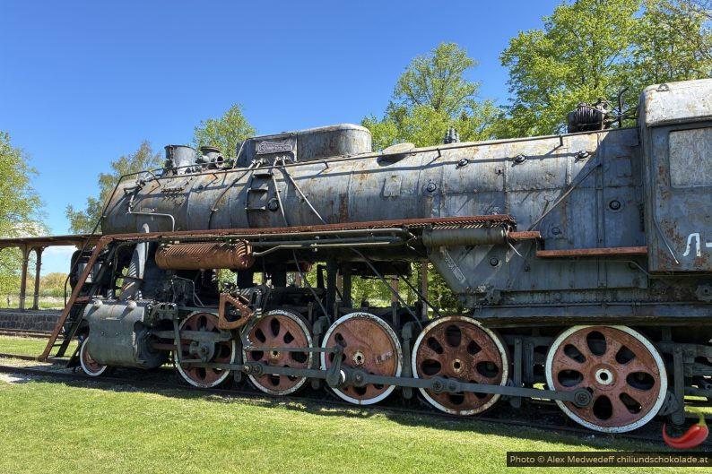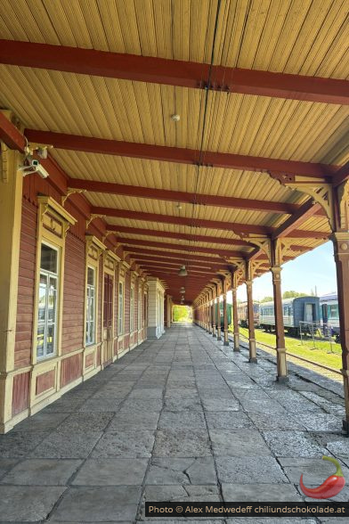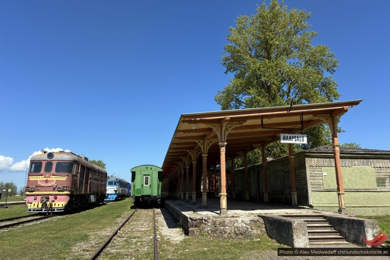 Am nächsten Tag machen wir uns in Richtung Fähre auf und halten auf dem Weg noch in Haapsalu, um den alten Bahnhof dort zu besichtigen. Eigentlich dachten wir, dass wir nicht viel sehen werden, aber die Züge und Lokomotiven stehen im Freien und sind gut beschildert. Nur das Museum hat nicht geöffnet.