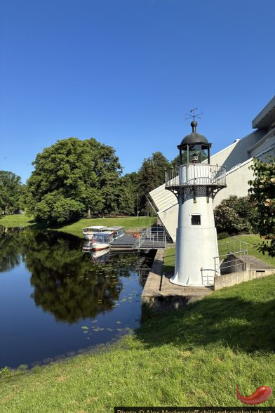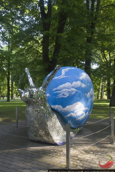 Und wir werden nicht enttäuscht. Wir überqueren die Brücke über die Düna und radeln nördlich in den Kronvalda Parks. Dort steht ein kleiner sehenswerter Leuchtturm und eine übergrosse Schnecke, die mit Spiegeln verziert ist.